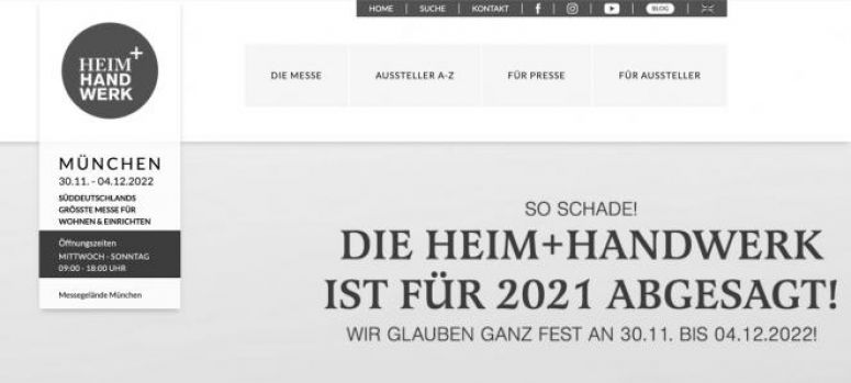 Aus der Möbel- oder Küchenmöbelbranche hätten sich beteiligt: Polstermöbel Fischer, Küche und Plan Wieser, Wohnfabrik / Pappe La Papp oder Biller. Auch Küchenquelle hätte sich normalerweise engagiert, als Aussteller im „Freundin“-Haus wären die Küchen der neuen Kooperation mittels Hololens erfahrbar gewesen. Heim+Handwerk und die parallel stattfindende Food&Life mit 600 Ausstellern sind damit auf 2022 verschoben. Sie sollen dann vom 30. November bis 4. Dezember stattfinden.