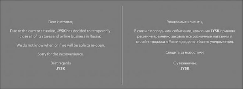 Die 86 Filialen des dänischen Möbelhandels-Riesen Jysk in der Ukraine wurden am vergangenen Freitag geschlossen, wie das Unternehmen auf seiner Webseite und in den sozialen Medien mitteilt. Die Mitarbeiter sollen weiter bezahlt werden, geflüchteten Mitarbeitern sollen Stellen in anderen Ländern angeboten werden.