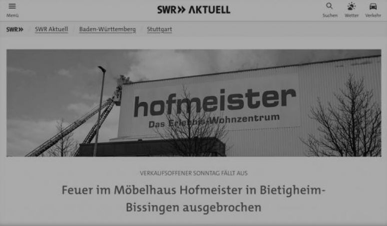 Am Hauptstandort des EMV-Händlers Hofmeister in Bietigheim-Bissingen ist am Sonntagvormittag ein Brand ausgebrochen, der vermutlich von der Schlafzimmerabteilung ausging. Rund 100 Feuerwehrleute sind vor Ort. Es berichten diverse lokale und überregionale Medien von Stuttgarter Zeitung bis zeit.de.