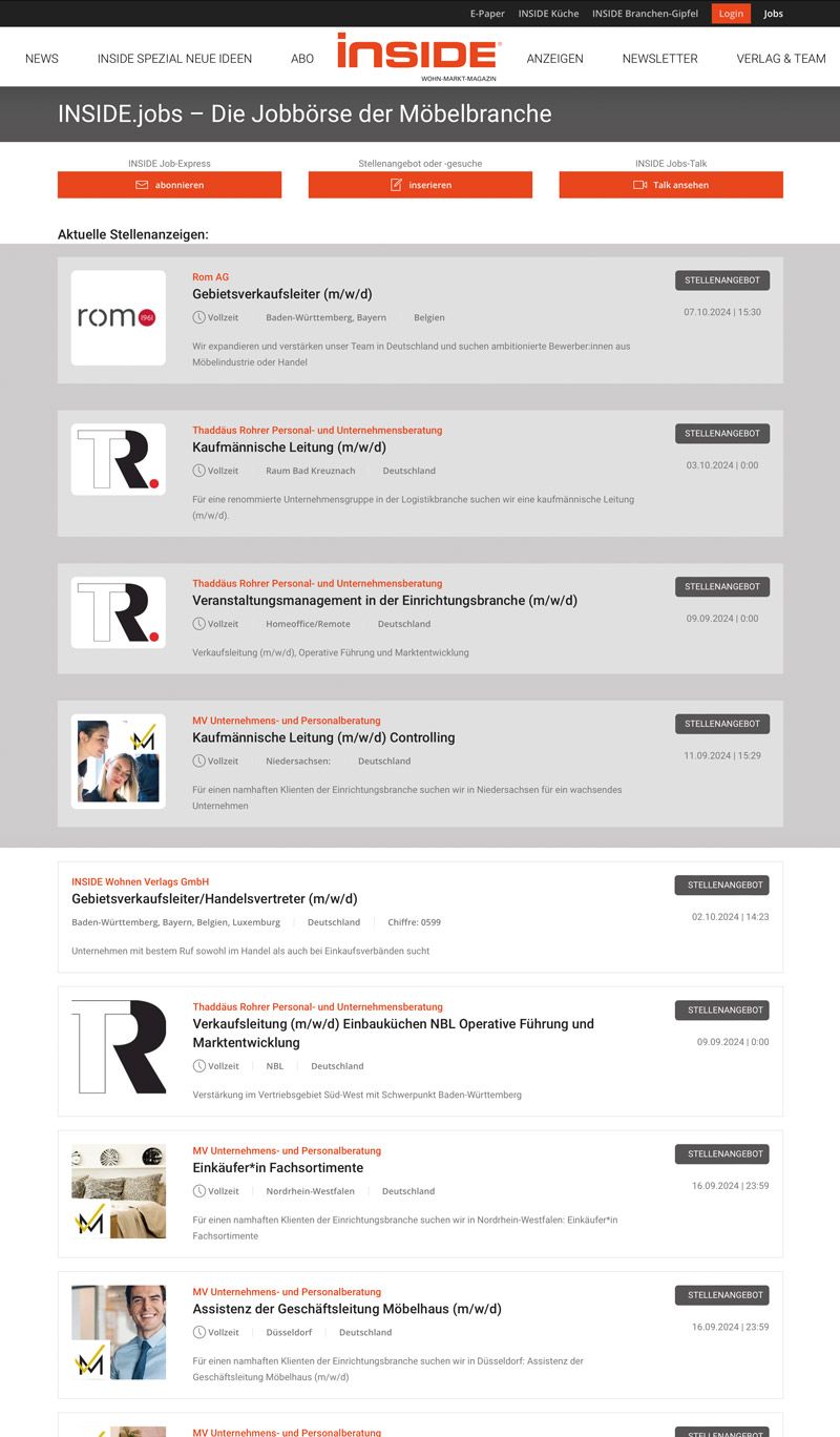 Mit INSIDE Jobs haben wir die Plattform für den Stellenmarkt in der Möbelbranche aufgebaut und im vergangenen Jahr aufgefrischt, begleitet von einer neuen, aktiven Kommunikationsstrategie. Stellenangebote werden eingebunden als „Job des Tages“ auf der Startseite von www.inside-wohnen.de, sie werden im Newsletter „Post von INSIDE...“ platziert.
