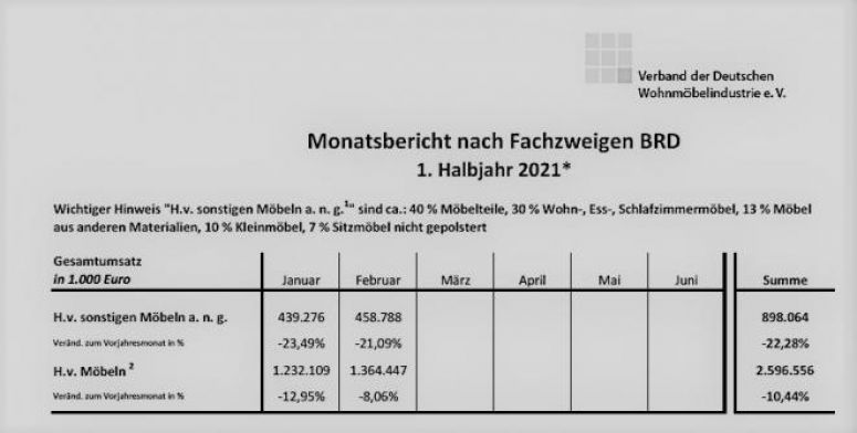 So ist zum Beispiel der Polstermöbelumsatz (da wird bekanntlich in der amtlichen Statistik nur die Produktion in Deutschland einbezogen) in den ersten beiden Monaten nur um 1,6 Prozent gesunken. Der Inlandsumsatz ging um 0,8 Prozent und der im Export um 3,4 Prozent zurück. Erträglich in Anbetracht der Tatsache, dass die meisten Läden in den beiden Monaten geschlossen waren. Diese Zahlen dürfen aber natürlich nicht darüber hinwegtäuschen, dass in dieser Zeit größtenteils die Auftragsbestände aus dem letzten Jahr abgearbeitet wurden. In den darauffolgenden Monaten dürfte es umsatzmäßig schlimmer aussehen.