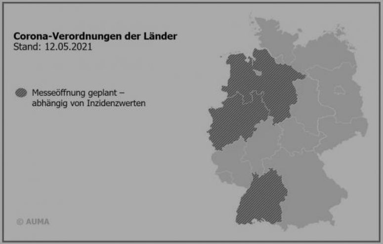 Ob und wann in Deutschland wieder Messen veranstaltet werden dürfen, das ist trotz Bundesnotbremse nach wie vor Ländersache. Laut dem Verband der Deutschen Messewirtschaft AUMA sind Messen aktuell in allen Bundesländern noch verboten, in NRW, Niedersachsen und Baden-Württemberg wurden in den letzten Tagen allerdings endlich die Rahmenbedingungen festgelegt, unter denen Messen überhaupt wieder möglich gemacht werden sollen. Abhängig ist das, wie sollte es anders sein, vom Unterschreiten bestimmter Inzidenzwerte.