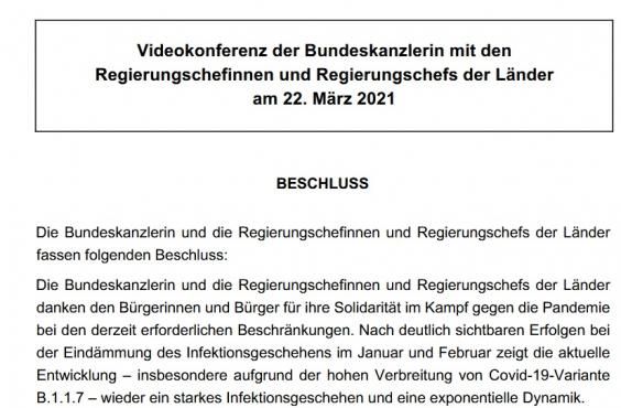 Der Tagesspiegel meldet - und inzwischen zahlreiche weitere Medien übereinstimmend, dass Bund und Länder den Corona-Lockdown bis zum 18. April verlängern wollen. Außerdem zeichnet sich ein Appell an die Firmen ab. Dies gehe aus der Beschlussvorlage des Kanzleramts für die morgigen Beratungen hervor, die dem Tagesspiegel vorliege. „Die bestehenden Beschlüsse der Bundeskanzlerin und der Regierungschefinnen und Regierungschefs der Länder bleiben weiterhin gültig, sofern dieser Beschluss keine abweichenden Festlegungen trifft. Die Länder werden ihre Landesverordnungen entsprechend anpassen und bis zum 18. April 2021 verlängern“, heißt es darin. Offiziell werden sich die Länderchefs und die Kanzlerin am morgigen Montag zusammenschließen.