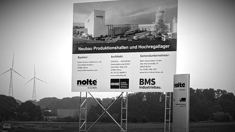 Im August hat Nolte Küchen in Melle mit den Bauarbeiten für die Erweiterung am Standort Melle begonnen. Während der Herbstmessen war zumindest das Baustellenschild schon zu sehen.
