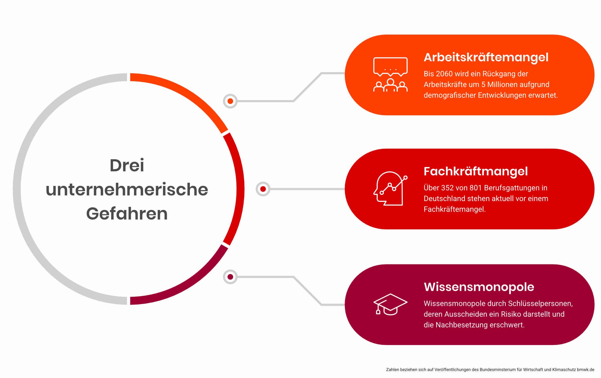 Neben der Herausforderung des ständigen Wandels kommt die aktuelle Situation in Deutschland hinzu, die von drei großen unternehmerischen Risiken geprägt ist. Erstens wird prognostiziert, dass der Arbeitsmarkt bis 2060 etwa fünf Millionen Arbeitskräfte aufgrund demografischer Entwicklungen weniger haben wird. Zweitens sind laut Informationen des