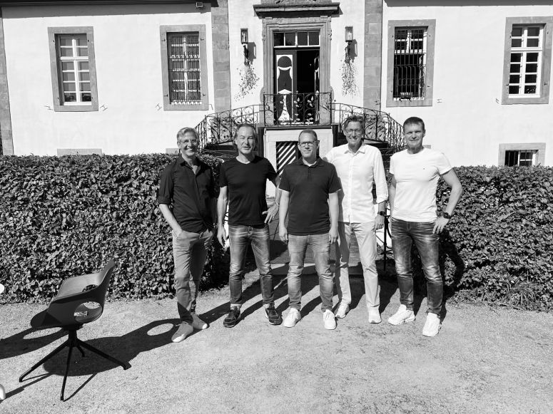 Die Sonne knallt vom Himmel. Die Aussteller im Schloss Bosfeld, acht an der Zahl, stehen in T-Shirts auf dem Balkon vor dem Schloss-Eingang in Rheda-Wiedenbrück. Im Garten wird gerade der Grill angeschmissen. Es ist Mitte September. Es fühlt sich allerdings an wie Mitte Juli. Hier und da transportiert ein Aussteller noch ein Möbelstück in die Ausstellung. „Wir eröffnen offiziell erst morgen. Heute treffen sich die Aussteller und besprechen letzte Details“, sagt Bernd Schellenberg, früher Schramm-Geschäftsführer und heute in beratender Funktion für Toma Flach – Initiator der Ausstellungsfläche im Schloss – und dessen Firma Fine Furniture tätig.
