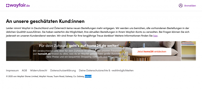 Aus Wettbewerbern werden Werbekunden. Oder wie soll man das fette Home24-Banner interpretieren, das seit Kurzem auf der bisherigen Shop-Seite von Wayfair Deutschland zu finden ist? Den Rückzug aus dem deutschen Markt hatte der US-Online-Möbler vor knapp zwei Wochen abrupt verkündet, der kompletten Belegschaft Kündigungen geschickt und Lieferanten die Ware abholen lassen.