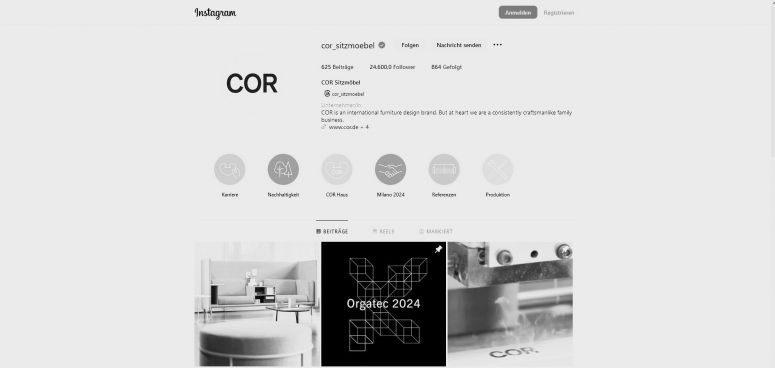 Cor bespielt Instagram, LinkedIn, Pinterest und Facebook. Der wichtigste Kanal für Cor ist nach wie vor Instagram, so Thiessen. Dort läuft aktuell bis November noch eine Kampagne, die gemeinsam mit der Agentur Instadttreffen aus Weimar entwickelt wurde. „Seit Mai schicken wir ein Möbelstück auf Reisen zu insgesamt acht Content-Kreatoren. Jeder der auserwählten Partner