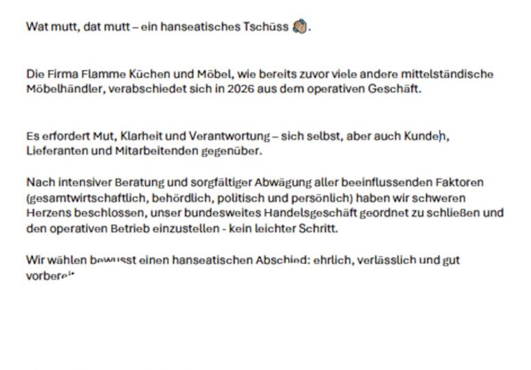 Die Firma Flamme Küchen und Möbel, wie bereits zuvor viele andere mittelständische Möbelhändler, verabschiedet sich in 2026 aus dem operativen Geschäft.